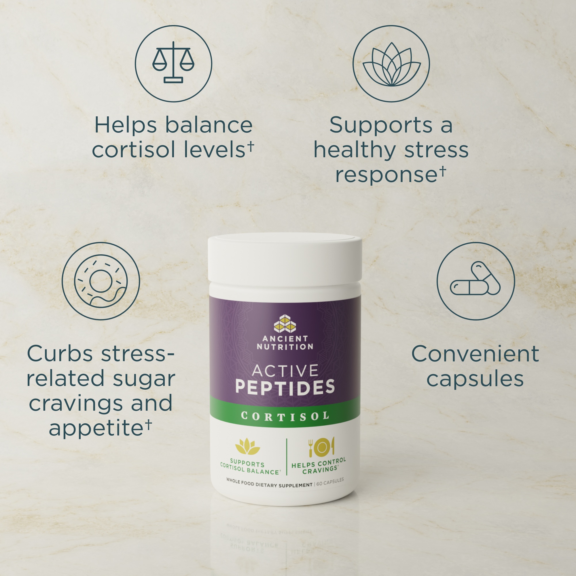 Designed with science-backed key ingredients, Active Peptides Cortisol Support† helps your body get out of “survival mode” by targeting stress at its source — cortisol. Each serving combines bioactive yeast peptides, patented L-theanine, and adaptogenic botanicals to improve cognitive function, curb stress-driven cravings, and support a balanced stress response.